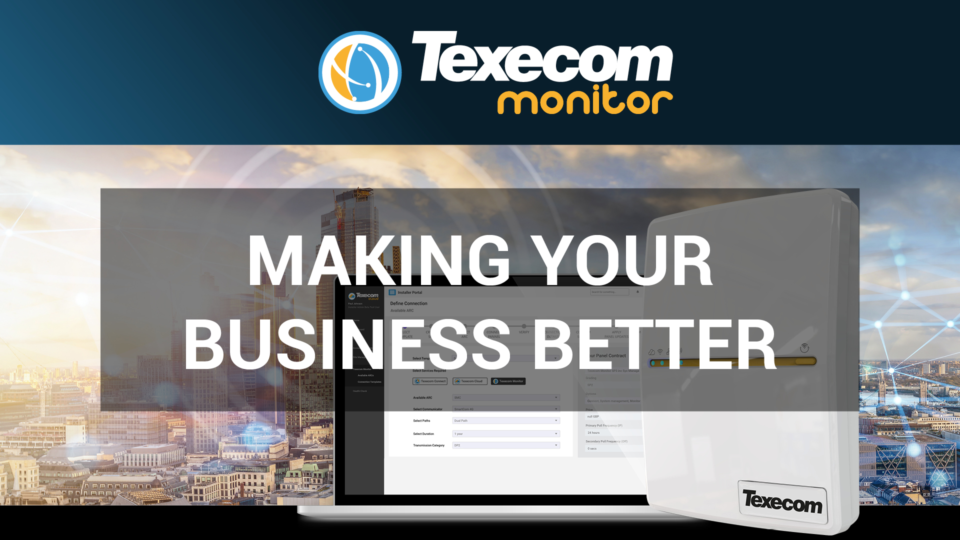 Apresentamos o Texecom Monitor. Texecom Monitor oferece sinalização aos principais Centros de Recepção de Alarmes e faz parte do conjunto de ferramentas e serviços digitais da Texecom especificamente concebidos para o ajudar a crescer e optimizar o seu negócio.